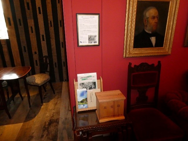 同館の発起人であり、館長の土橋正臣氏から、作家大佛次郎氏が英国のナショナル・トラスト思想を紹介し、ナショナル・トラスト運動により御谷の森を守ったことを思い起こすと、鎌倉と英国のつながりは深く、ナショナル・トラスト団体の先駆けである鎌倉風致保存会と連携することで、相互の普及啓発に寄与したいとの申出がありました。 こうしたご縁で、窓から御谷の森を望む ことができる4階フロアに、ナショナル・ トラスト、御谷騒動、鎌倉風致保存会や古都保存法を説明するパネルを展示しています。ちなみに、鶴岡八幡宮の背後に御谷の森を望むためには、4階くらいの建物に上る必要があります。このパネルの右下の画は、窓から見える御谷の森の鉛筆画で、当会の幹事である大竹正芳氏に描画をお願いしたものです。この鉛筆画を拝見したとき、本物の写真を見ているような感覚を覚えました。